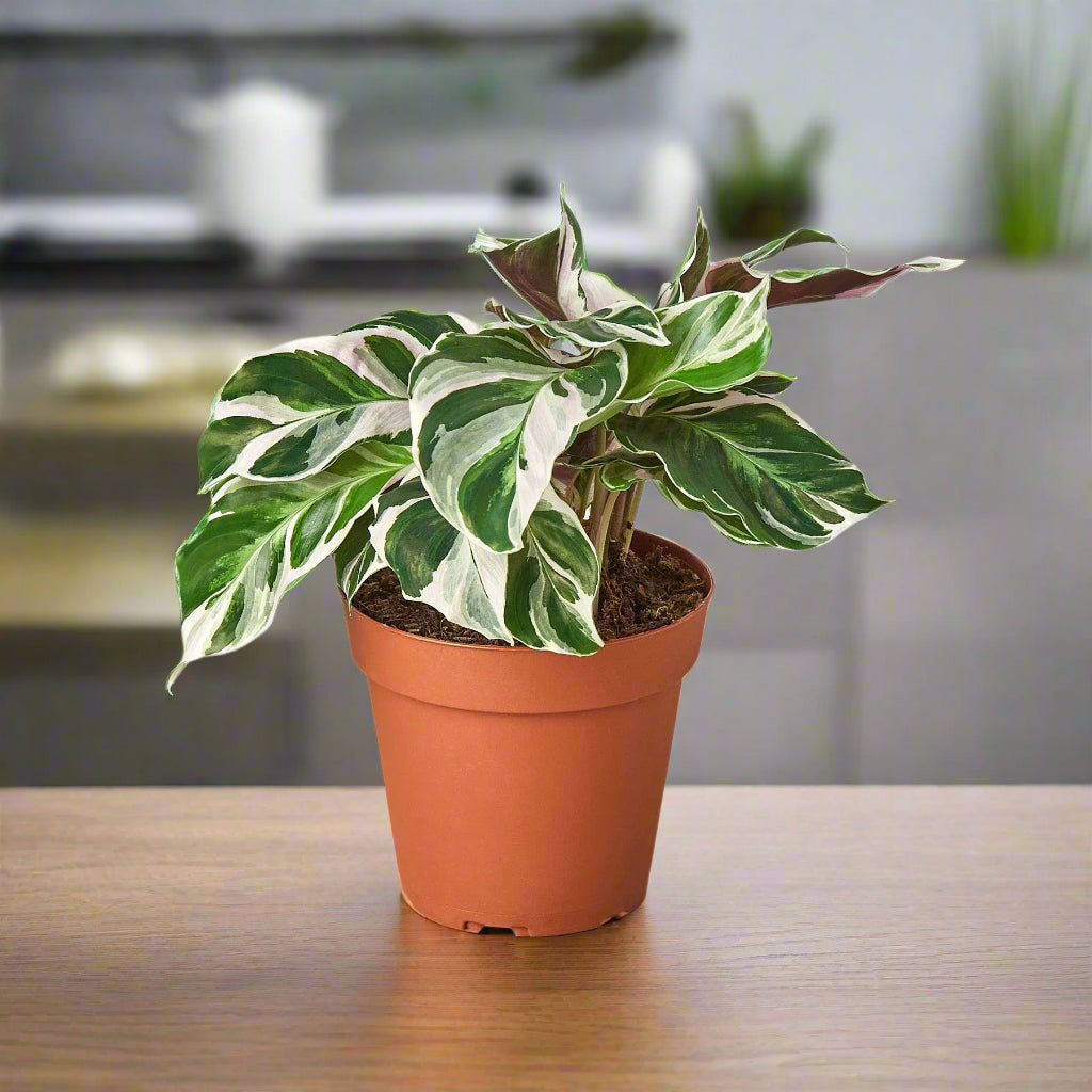 Well hello there, rare plant collector! Meet the absolutely stunning Calathea 'White Fusion' - a rare prayer plant so spectacular with its white and green fusion patterns, it's like having nature's own artistic fusion bringing collector-worthy beauty and graceful movement to your space!