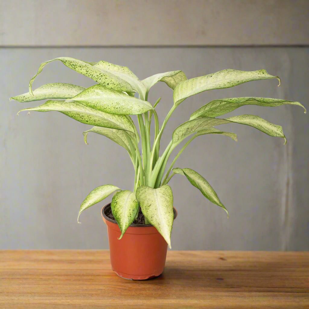 Well hello there, pattern lover! Meet the absolutely stunning Dieffenbachia 'Camouflage' - also known as Dumb Cane - a tropical beauty so distinctive with her unique variegation patterns and tactical charm, it's like having your own piece of living camouflage bringing strategic elegance and dense beauty to your space!