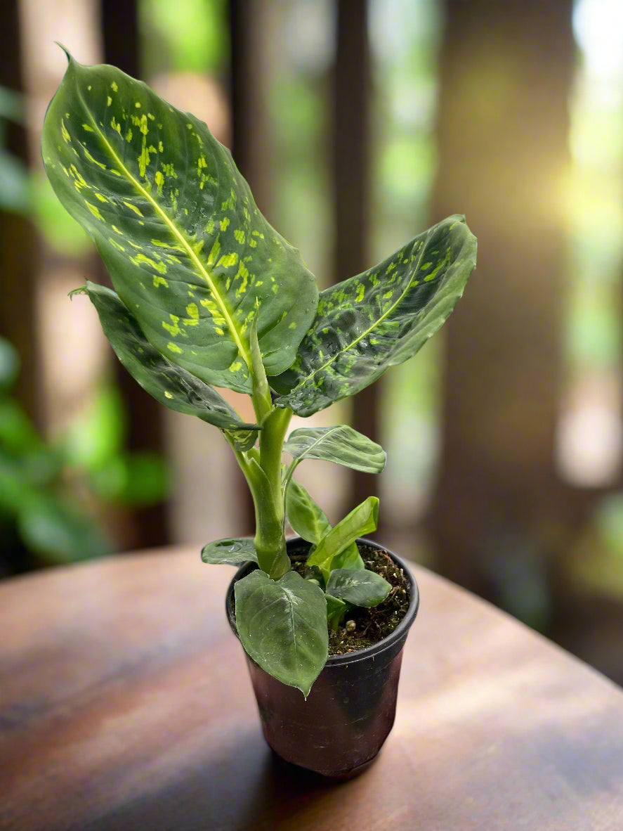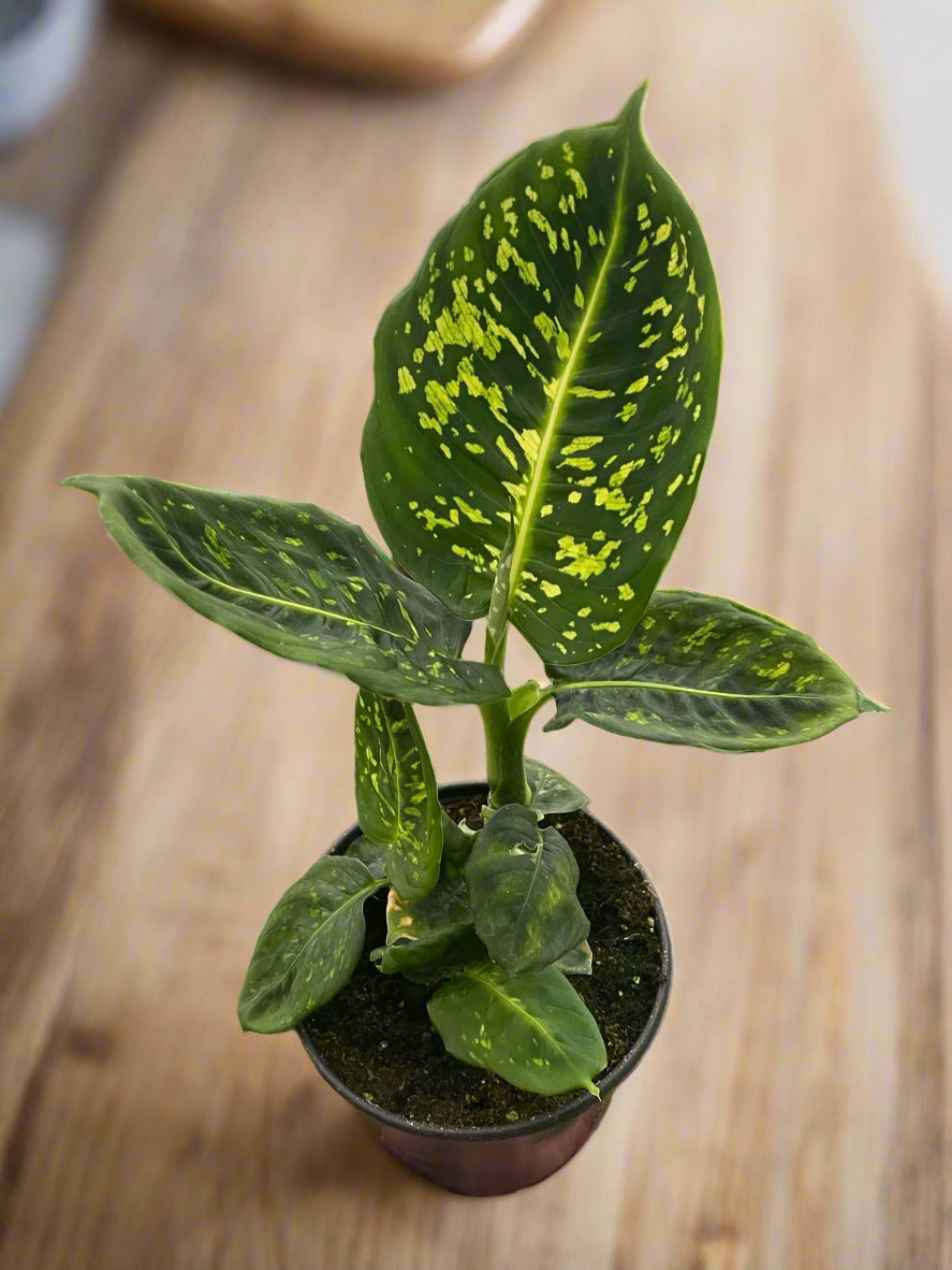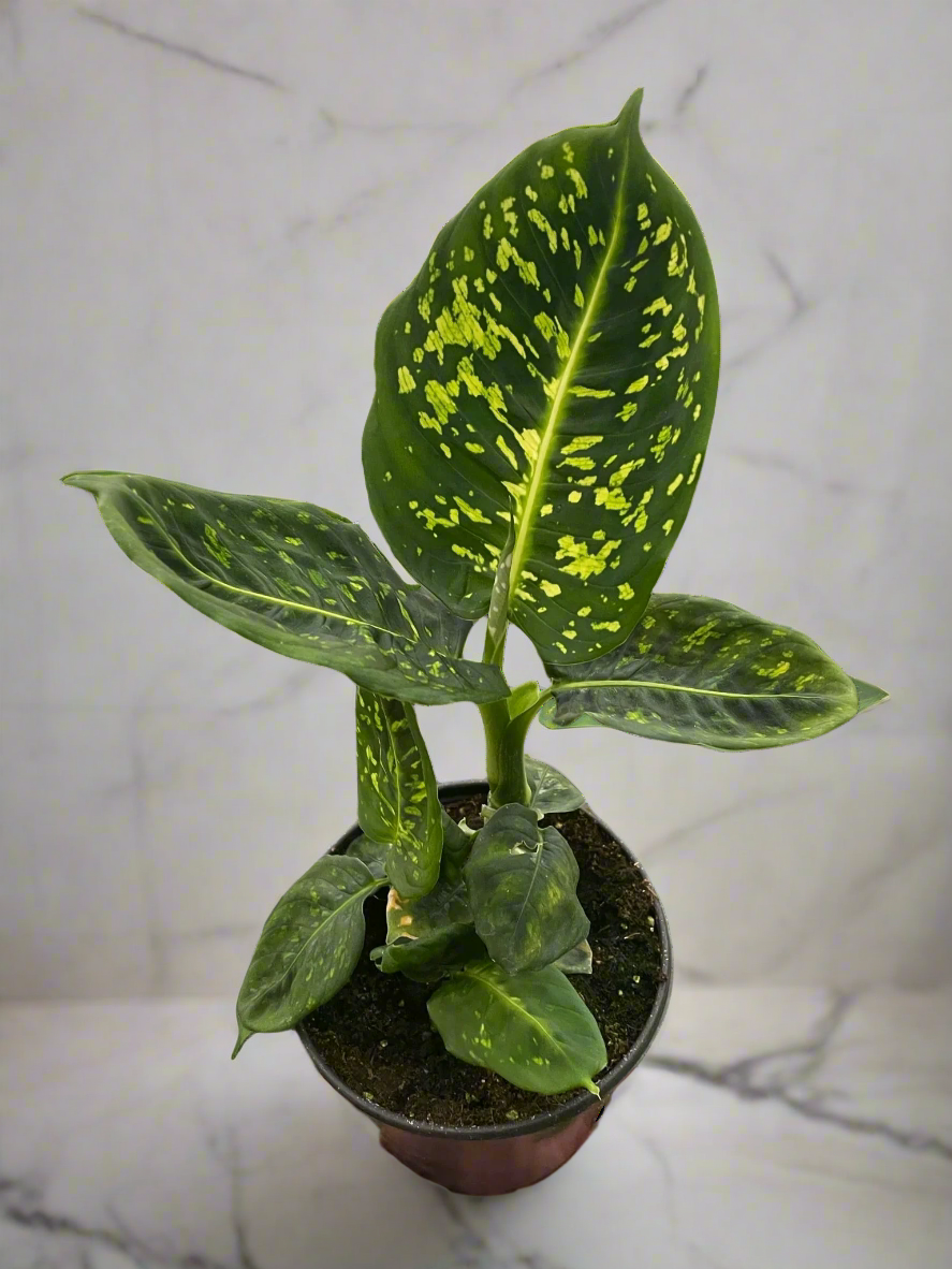Well hello there, light seeker! Meet the absolutely gorgeous Dieffenbachia 'Reflector' - also known as Dumb Cane Reflector - a tropical beauty so stunning with her lime green and yellow spots plus whitish-green central vein, it's like having your own light-reflecting wonder bringing luminous beauty and easy-care elegance to your low-light spaces!