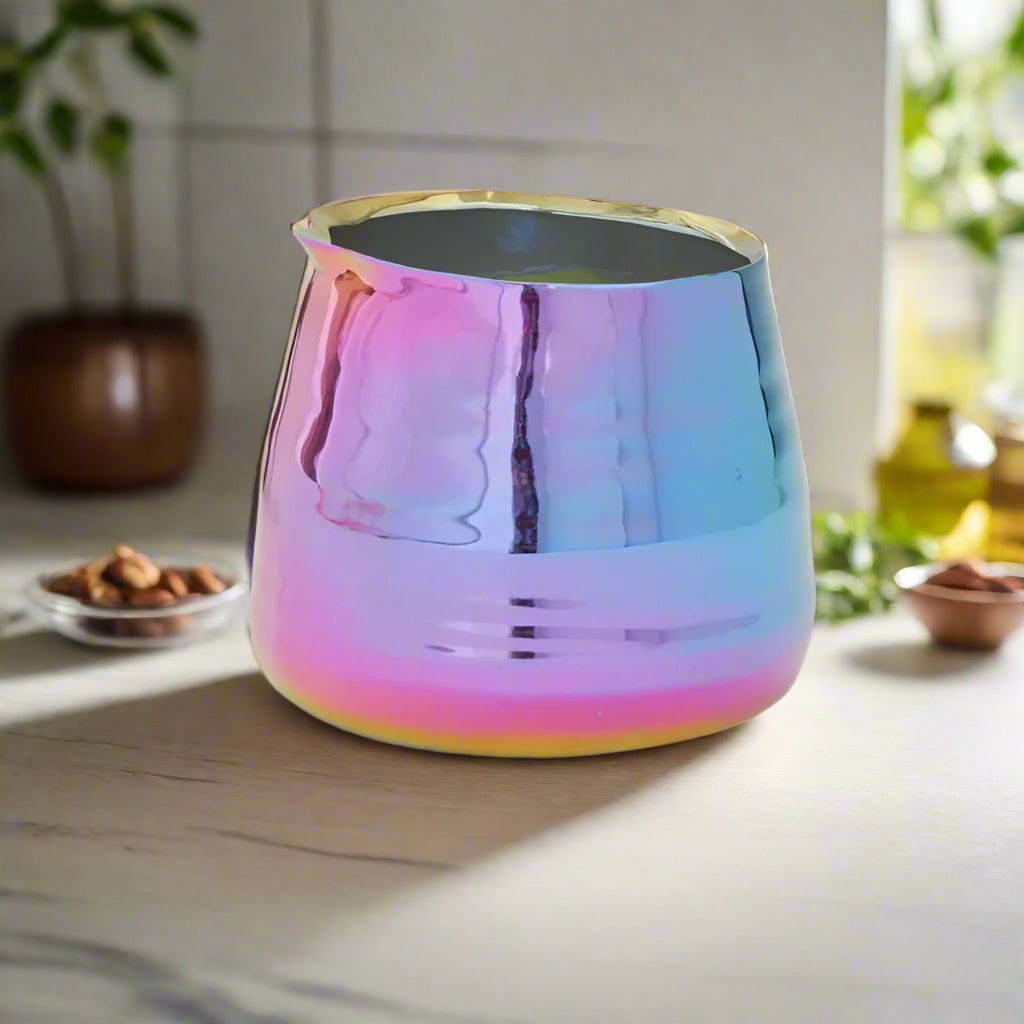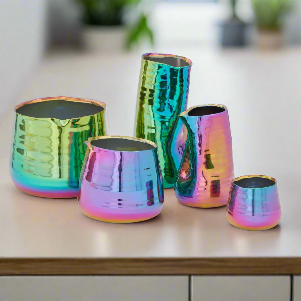Whether for plant shops, weddings, floral designs, or simply as an eye-catching accent in your home, this pot delivers visual impact with its vibrant, reflective colors. Its versatile size and unique finish make it a standout for any occasion or setting.
